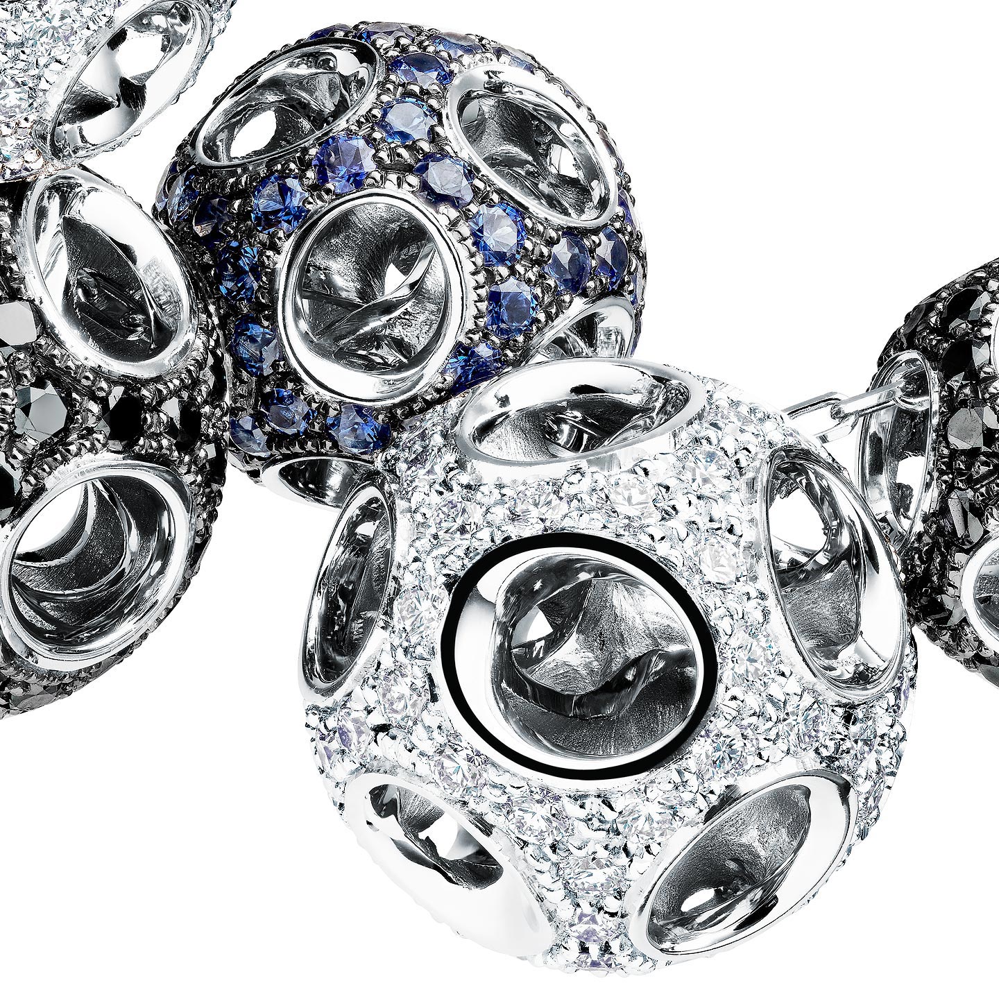 18K white gold, pavé diamonds, black diamonds and sapphires